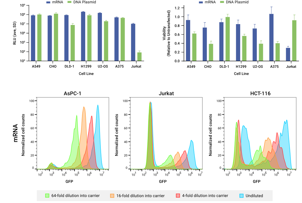 ViaScript® mRNA转染试剂能够确保整个细胞群体中实现均匀、可调节的表达,同时在具有挑战性的细胞类型中具备较高的转染效率且对细胞毒性极小。