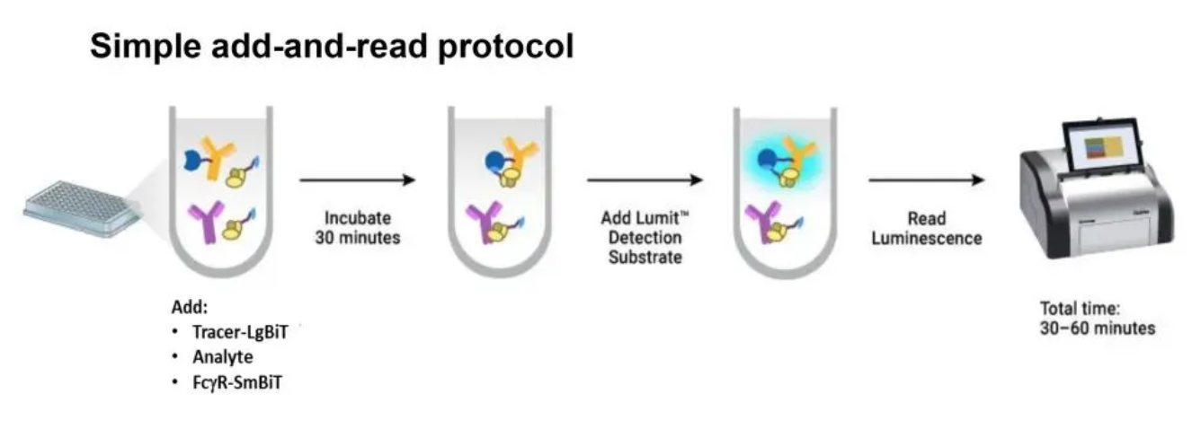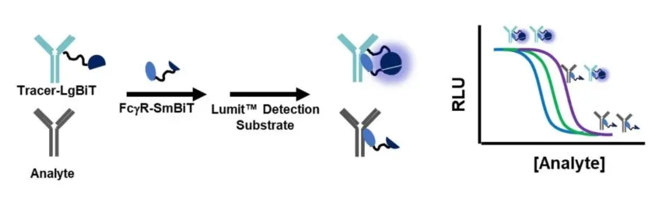 Lumit® FcγR Binding Immunoassays是基于NanoBiT® 蛋白互补技术的竞争性结合免疫检测。