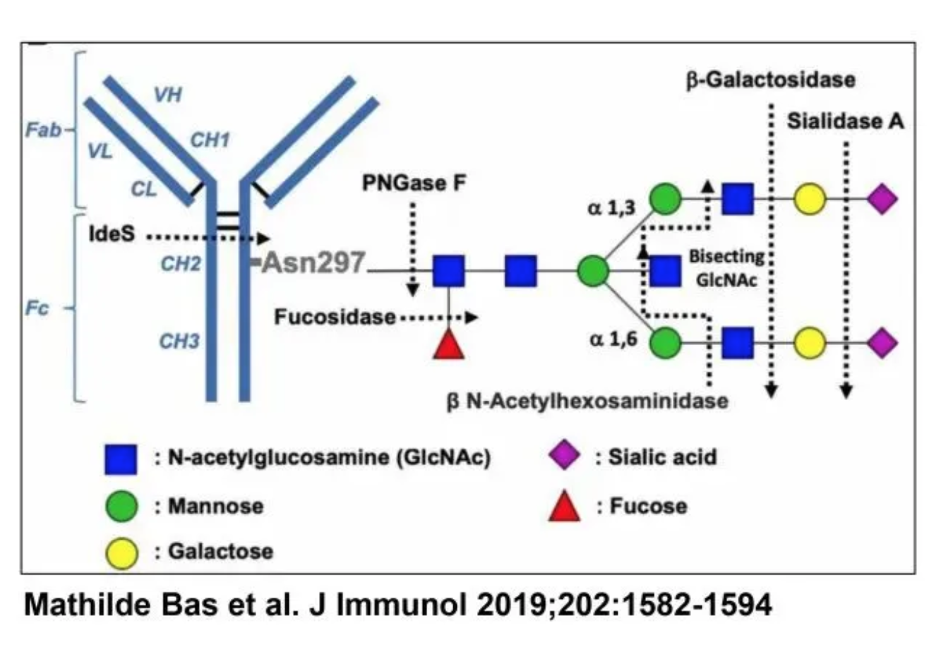 N297位点发生N-糖基化的IgG1分子示意图。糖基可以通过葡萄糖苷酶和抗体工程化方法进行修饰。