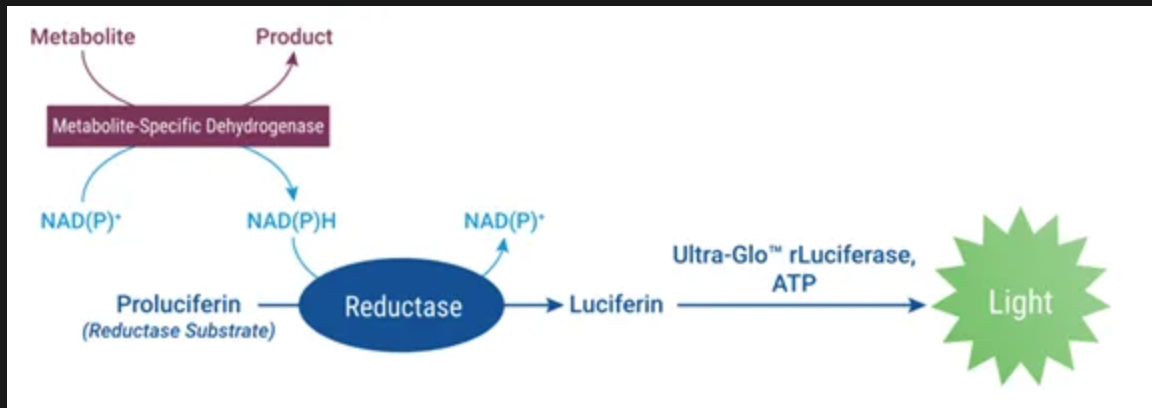 检测原理:Promega的生物发光代谢物检测法为监测关键代谢通路(包括葡萄糖利用、脂质代谢、氨基酸转运和线粒体功能)提供灵敏可靠的工具。这些检测法基于一个简单原理:代谢物特异性脱氢酶生成NAD(P)H,进而驱动前体萤光素底物转化为萤光素。在萤光素酶存在下,会产生与样品中代谢物含量成正比的光信号(图1)。