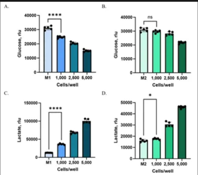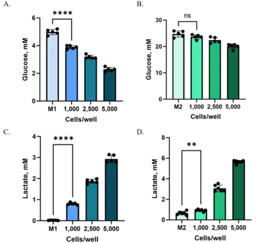 在较高细胞密度(每孔2,500和5,000个细胞)下,与对照相比,M1和M2培养基均显示出葡萄糖消耗和乳酸产生的明显变化(图3)。然而,在最低密度(每孔1,000个细胞)下,仅在M1中检测到变化。M1中较低的基线葡萄糖浓度和减少的背景代谢物创造了一个更灵敏的检测窗口,使得可以测量到在M2中被掩盖的细微变化。