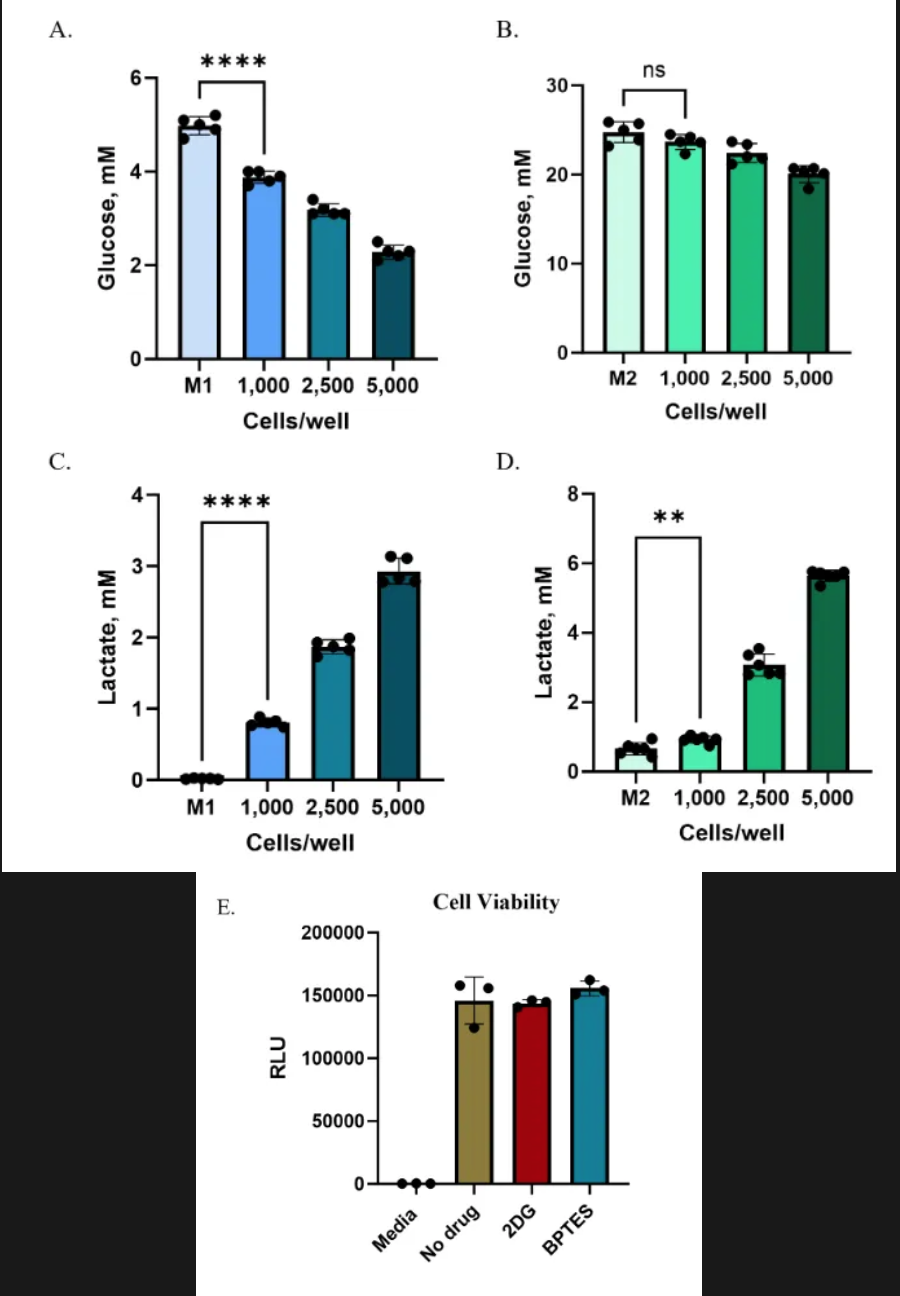 为确认代谢物水平的变化反映的是通路抑制而非细胞毒性,我们使用RealTime-Glo™ MT细胞活力检测系统测量了细胞活力。处理过的球状体的发光信号与未处理的对照组相当,表明2DG和BPTES在这些条件下没有毒性(图5E)。