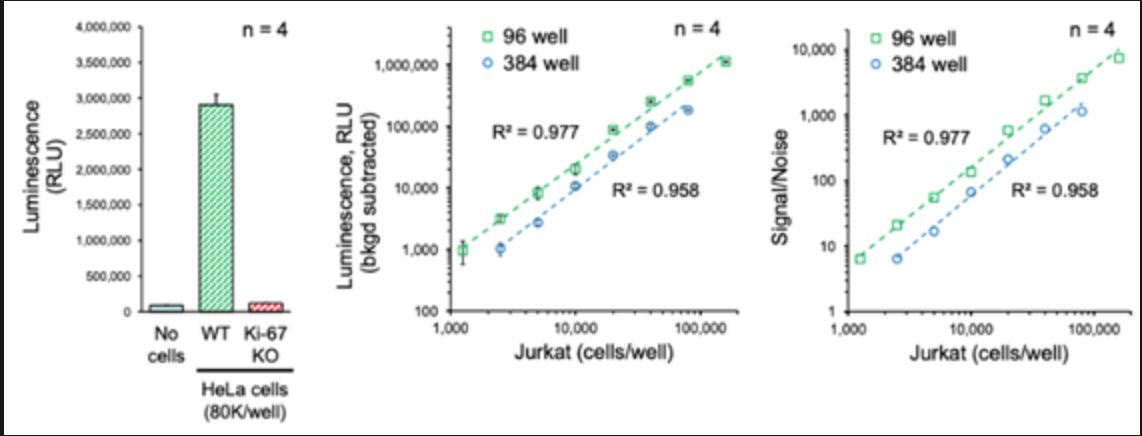 通过Lumit® hKi-67 immunoassay,Ki-67基因敲除细胞的细胞依赖性发光信号消失,证实了该方法对hKi-67蛋白水平的特异性。该检测在96孔板和384孔板中均显示,随着接种增殖细胞数量的增加,信号呈现良好线性关系。