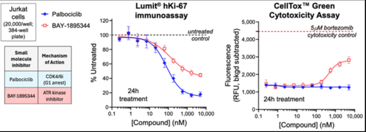 Lumit® hKi-67 immunoassay与细胞非渗透性荧光DNA染料(CellTox™ Green)的同孔联用方案,可区分不伴随(如帕博西尼)或伴随(如BAY-1895344)细胞杀伤的抗增殖活性。