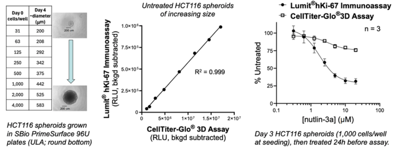 随着HCT116球体(未处理)尺寸增大,Lumit® hKi-67检测信号与平行孔测得的相对活细胞数量呈正比。在3D球体中,Ki-67蛋白水平的下降能更清晰、更早地提示抗增殖活性,且其反应窗口比活细胞数量测定更宽。