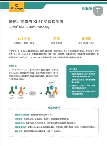 目前检测Ki-67的方法(如Edu)经常需要繁琐的步骤,cck-8等检测不准确不能直接反映增殖。Promega发布的新型的基于细胞样本的、均质型检测方法—Lumit® hKi-67 Immunoassay,无需繁琐的操作步骤,完美帮助您提高细胞增殖检测效率!