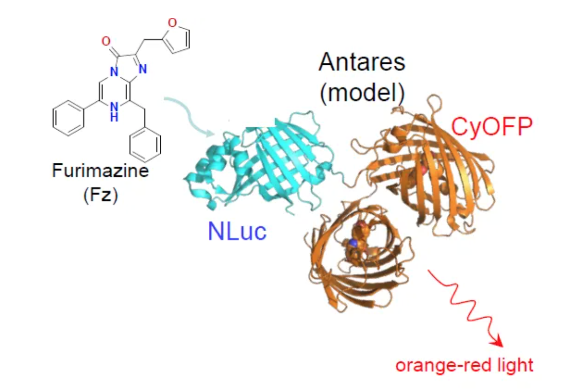 Antares是一种NLuc与CyOFP的融合蛋白,可在NLuc底物作用下发出明亮的橙色生物发光;
