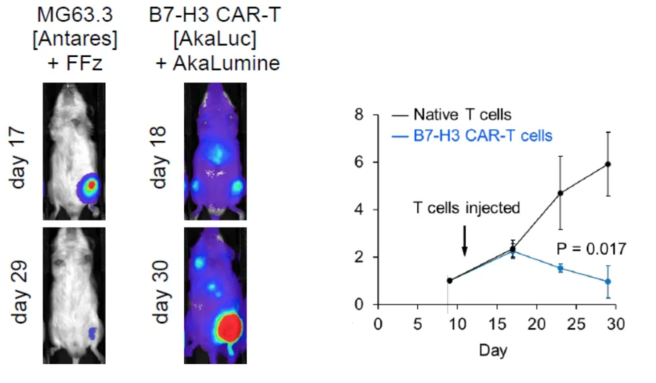 FFz是经过优化的Fz类似物底物,适用于外周体内生物发光成像——此处展示其与AkaLuc/AkaLumine在免疫肿瘤学中的多重检测应用1