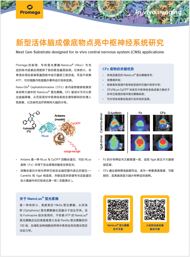 Promega的新型Nano-Glo® Cephalofurimazine(CFz)体内底物能够检测活体动物大脑中的 NanoLuc® 萤光素酶。CFz 被设计为可以穿过血脑屏障,从而实现对中枢神经系统生理和解剖的非侵入性探索,以及研究治疗药物向大脑的分布。