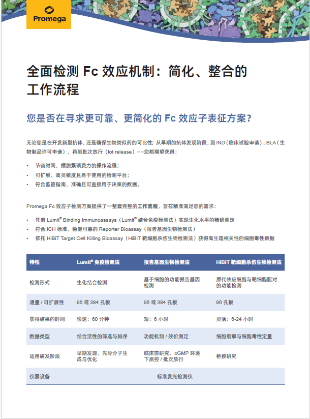 Promega 公司开发出一系列广泛的生物发光工具,使生物药物开发者能够从先导化合物筛选直至成品批放行全程评估其抗体治疗药物的 Fc 效应器功能。
