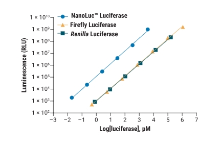 NanoLuc®, firefly 和 Renilla 萤光素酶检测的灵敏度比较 | |